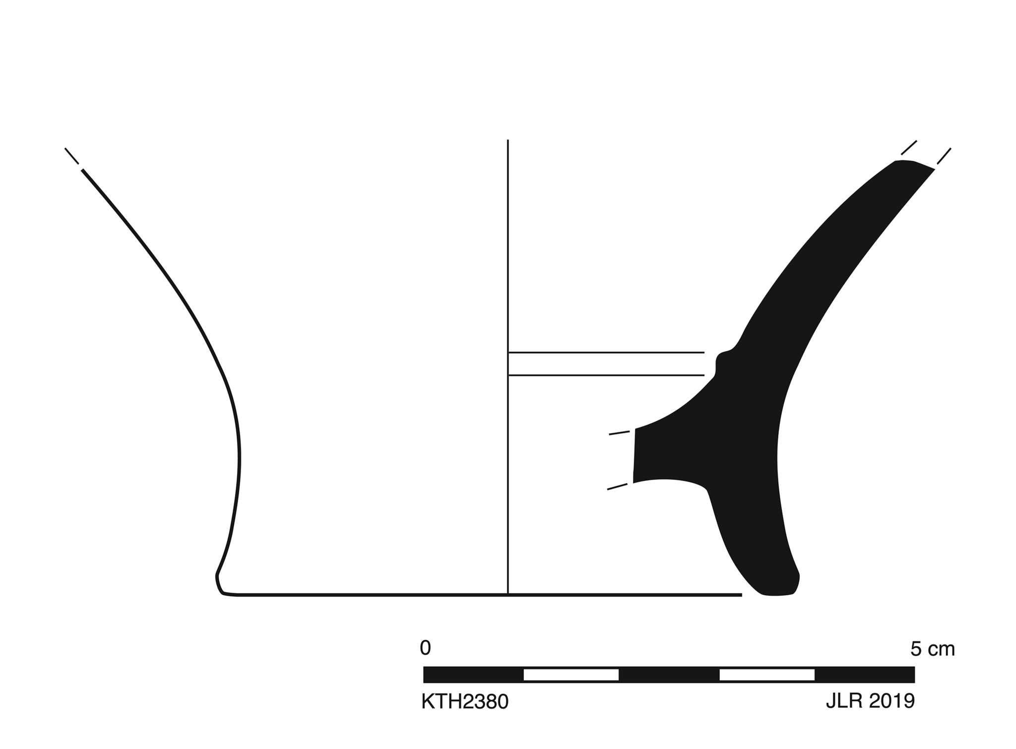 One sherd preserves ca. 27% of base and small part of lower wall. Slight, sparse abrasion and minor chipping; worn breaks; sparse, thin encrustation and faint clouding.