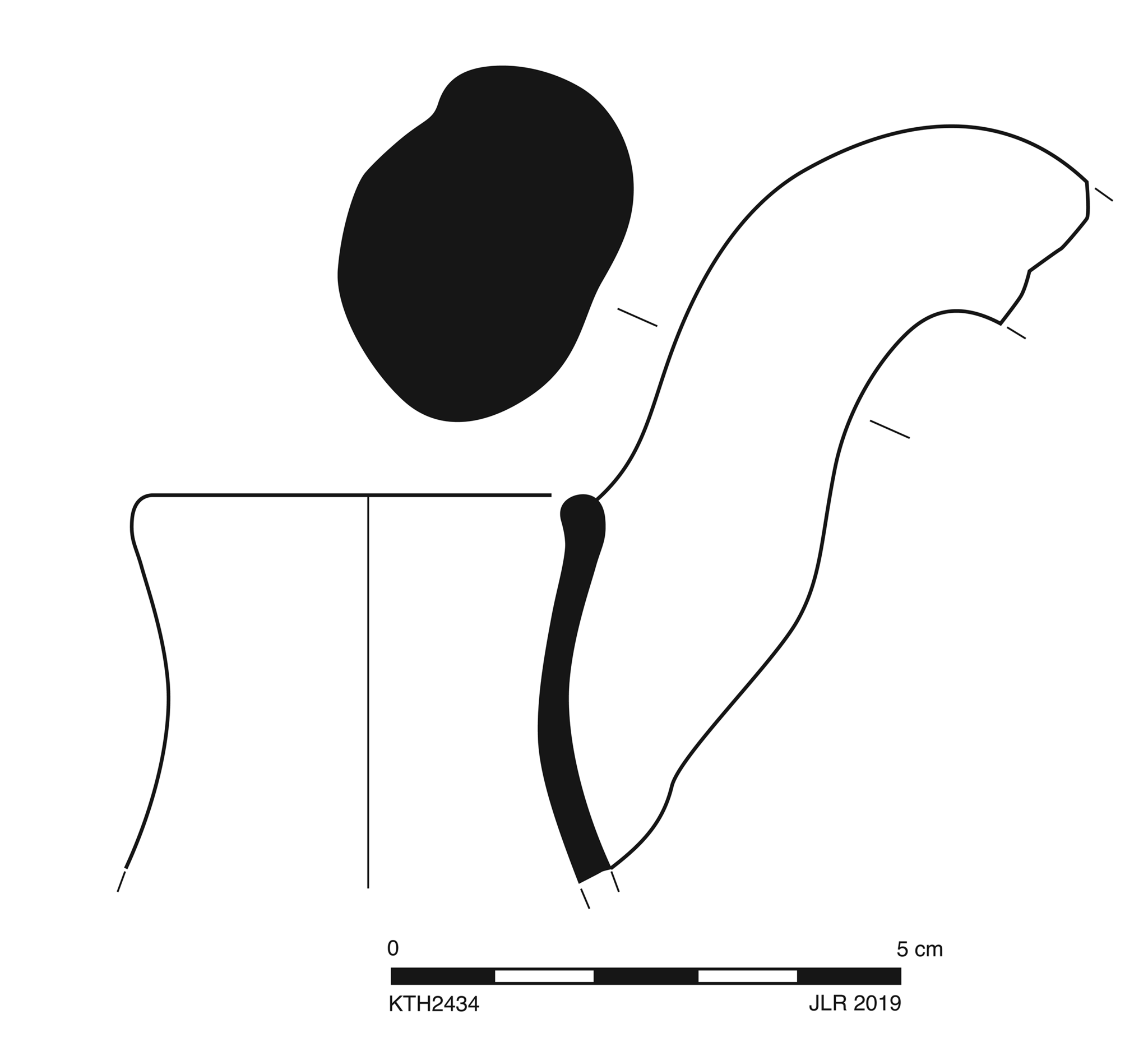 One sherd preserves upper part of one handle and small part of contiguous neck. Slight, sparse abrasion, scoring, and flaking; worn breaks; moderate, extensive encrustation.