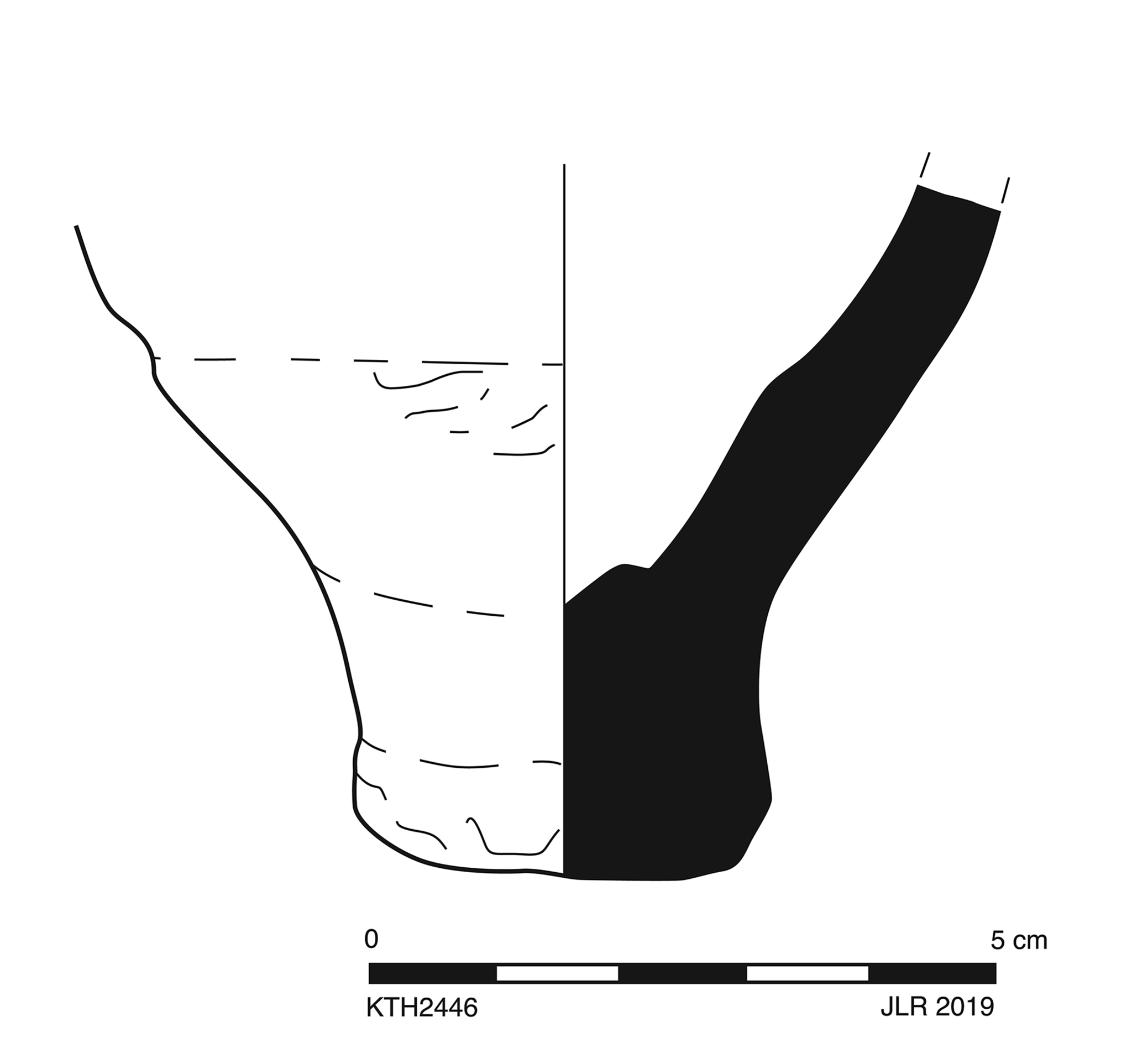 One sherd preserves entire toe and small part of lowermost body. Slight, sparse abrasion; slightly worn break; thick, extensive encrustation.