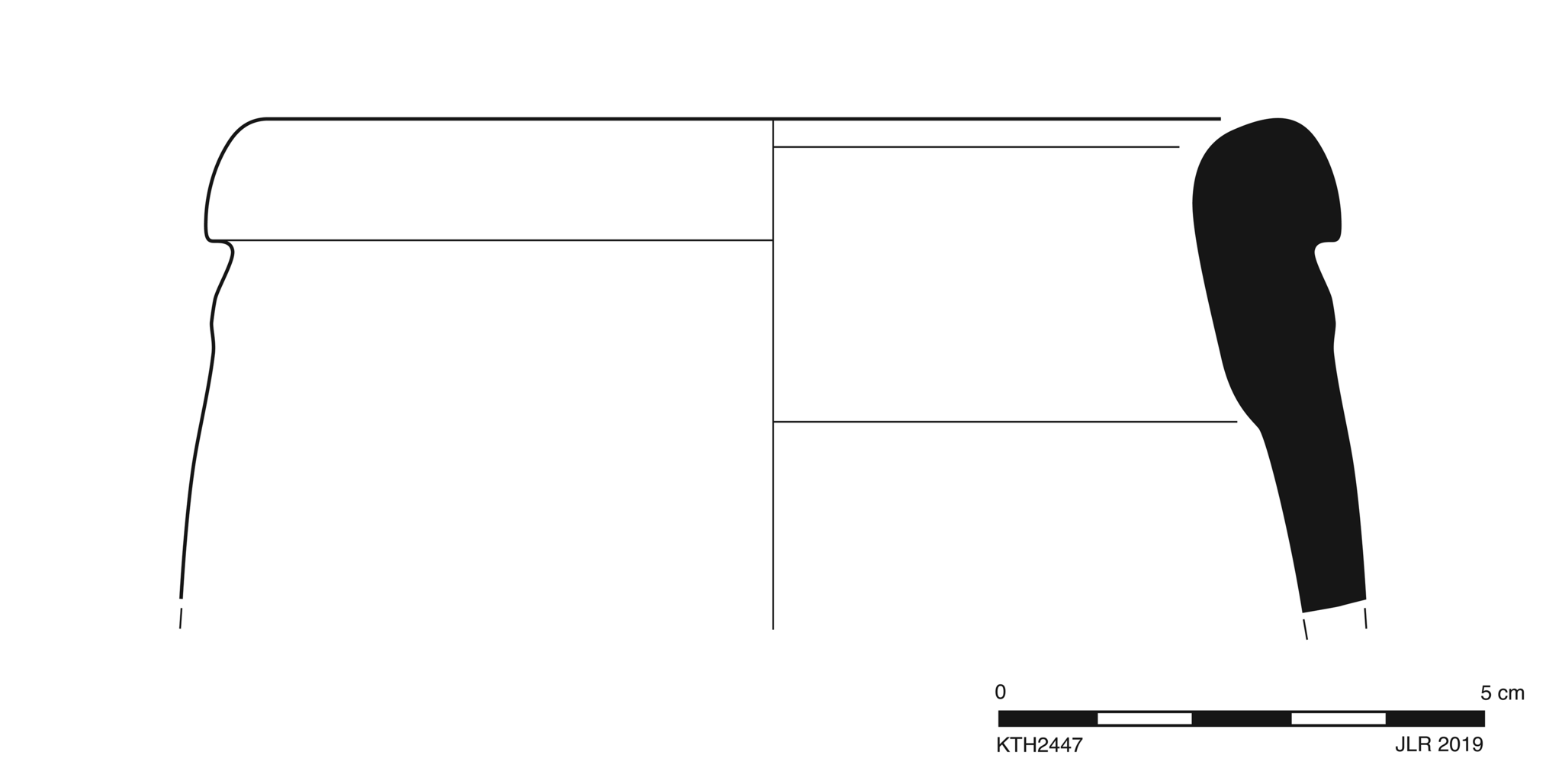 One sherd preserves ca. 25% of rim and part of upper neck. Slight to moderate, extensive(?) abrasion; worn breaks; thick, extensive encrustation.