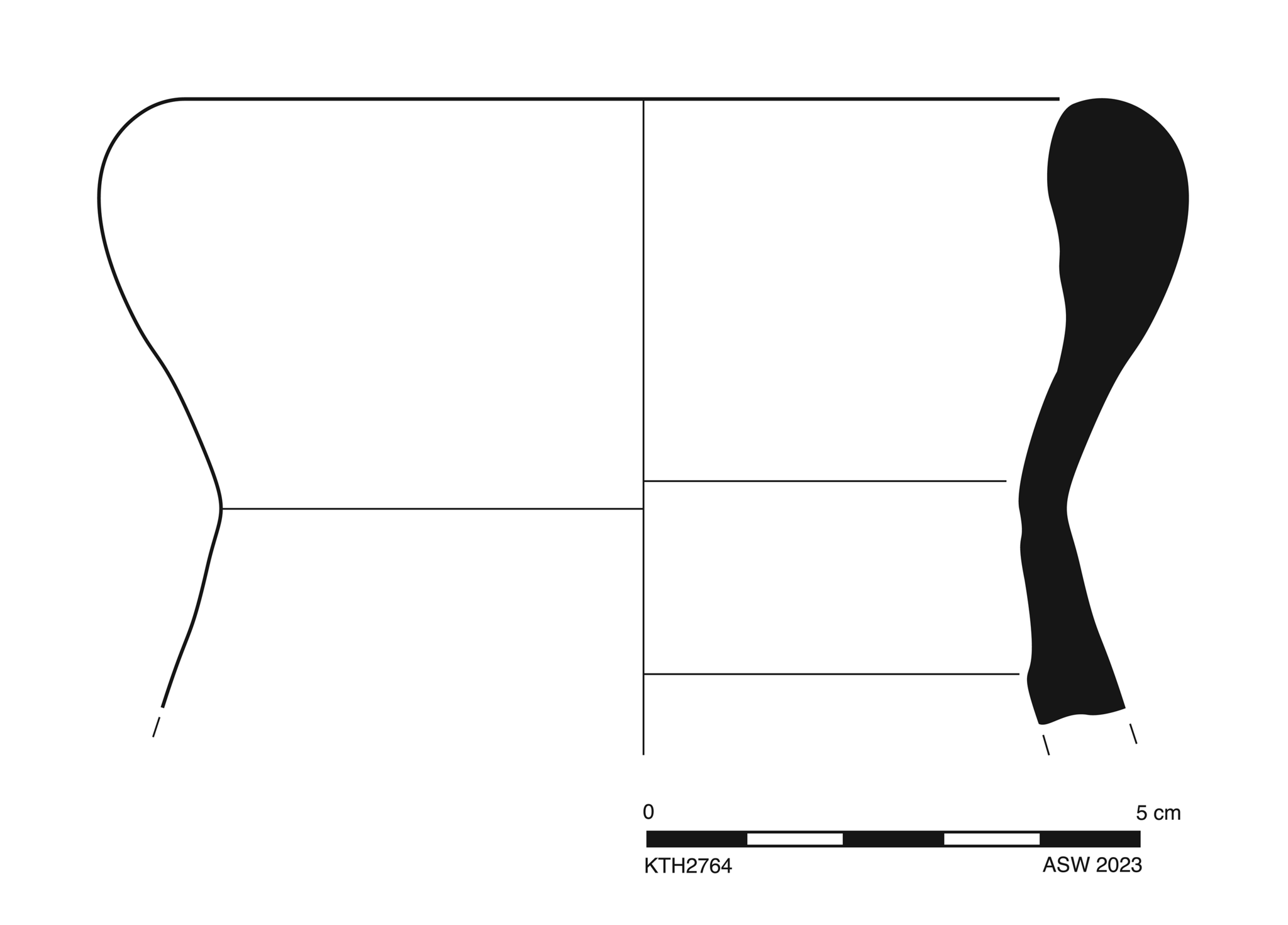 One sherd preserves 15% of rim and small part of upper neck. Slight, somewhat extensive abrasion; worn breaks; thin, extensive encrustation.