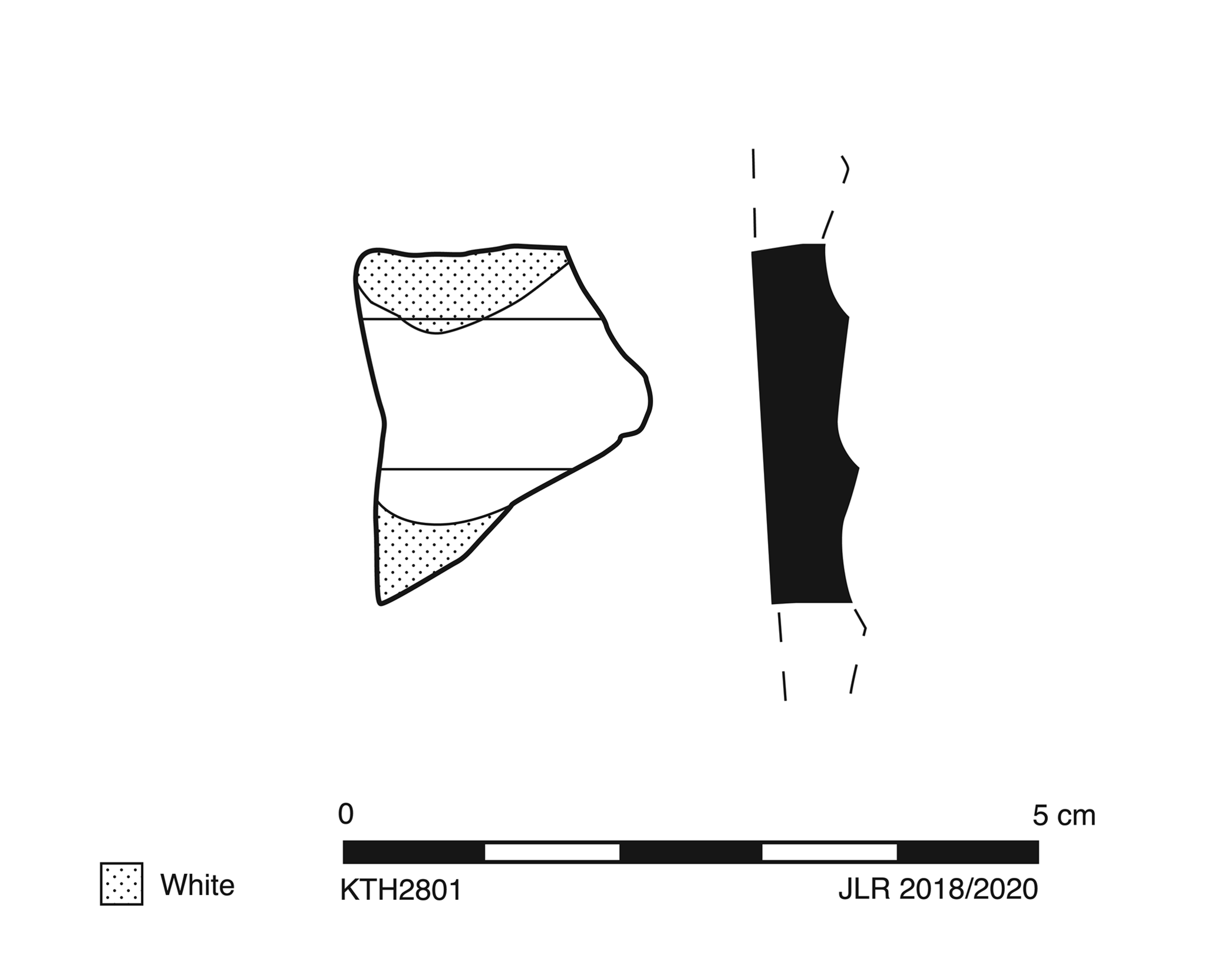 Reddish brown to orange fabric, slightly granular, with frequent varied tiny sandy inclusions, occasional round lime and angular quartz. Consistently fired to slightly darker red at surface. Thin, somewhat even, matte paint is yellowish white. Northern Palestinian.