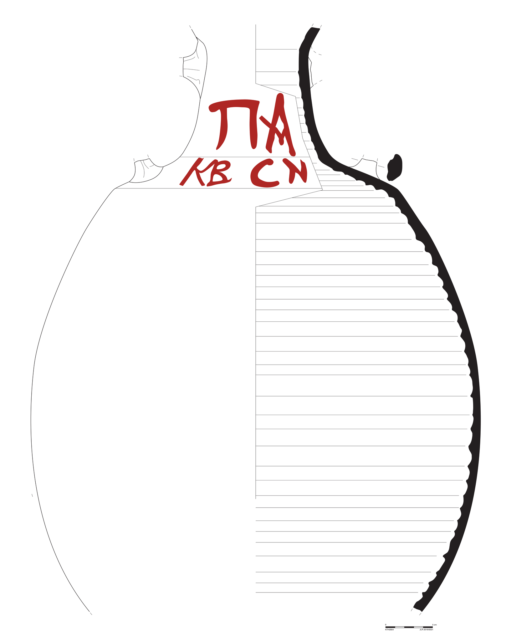 Wide, tapering neck; flaring rim. Rounded body with widest point below midpoint; carination as body turns to shoulder. Two vertical loop handles, oval in section, attach to neck above mid-point and to shoulder above carination. Red dipinto in two lines on neck to upper body: ΠΑ | ΚΒ ϹΝ (height of alpha is 7 cm).