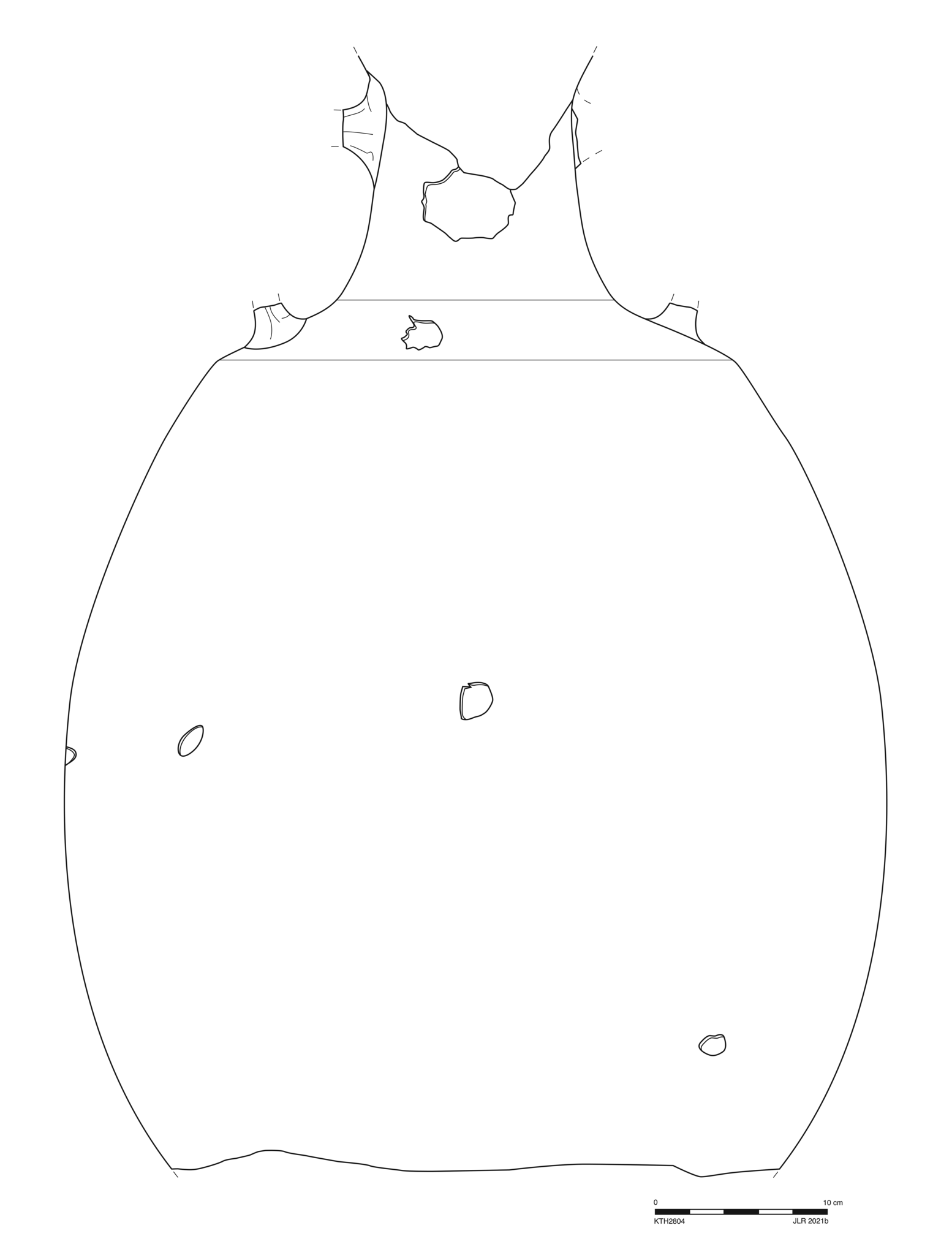 21 sherds preserve entire neck, stubs of handles at neck and lower part of one shoulder, most of body down to belly and past widest point; lower part and base has been intentionally removed as indicated by smaller group of two joining sherds; rim is entirely missing. Of these sherds 19 definitely join as single main group; two joining sherds were not attached to main group in conservation, though there is clear overlap, so that their position can be determined, and it is reflected in profile drawing. Slight, extensive abrasion and sparse, slight pitting and chipping; worn breaks; specks of encrustation. There are 9 perforations, 8 certainly ancient.