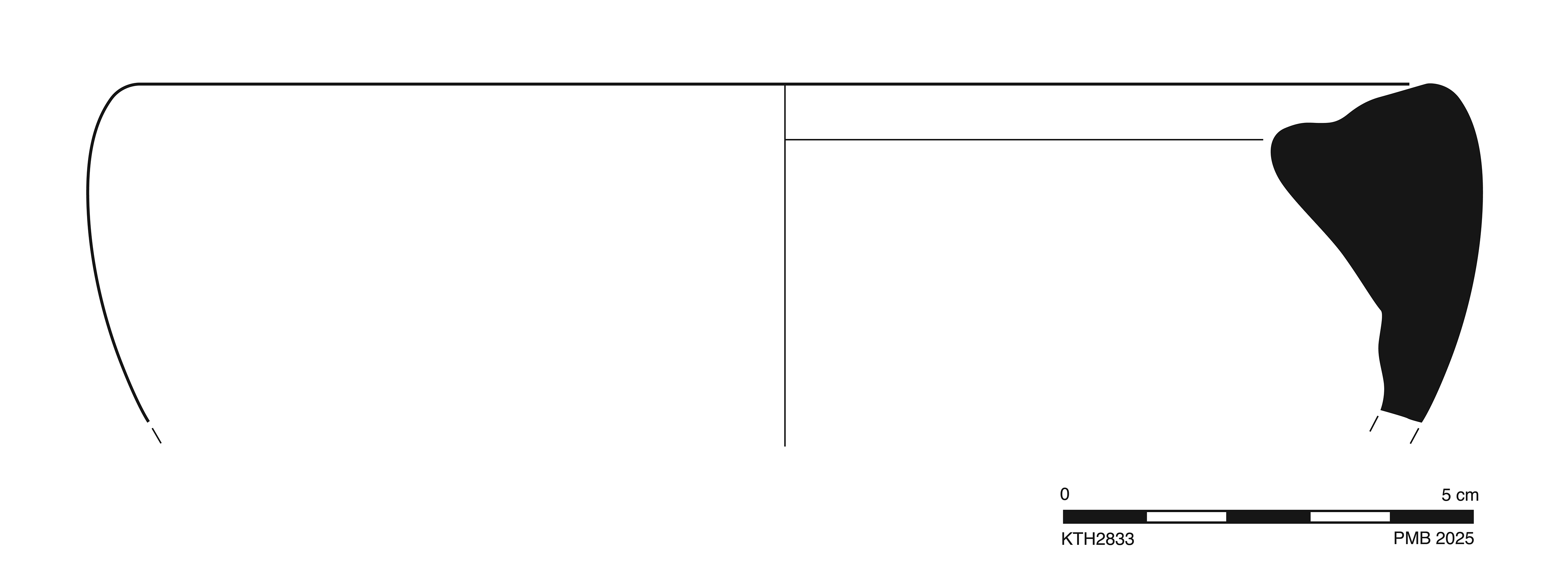One sherd preserves ca. 8% of rim and adjacent neck. Sparse, moderate abrasion and rare gouging; somewhat worn breaks; thick patch of encrustation on breaks.