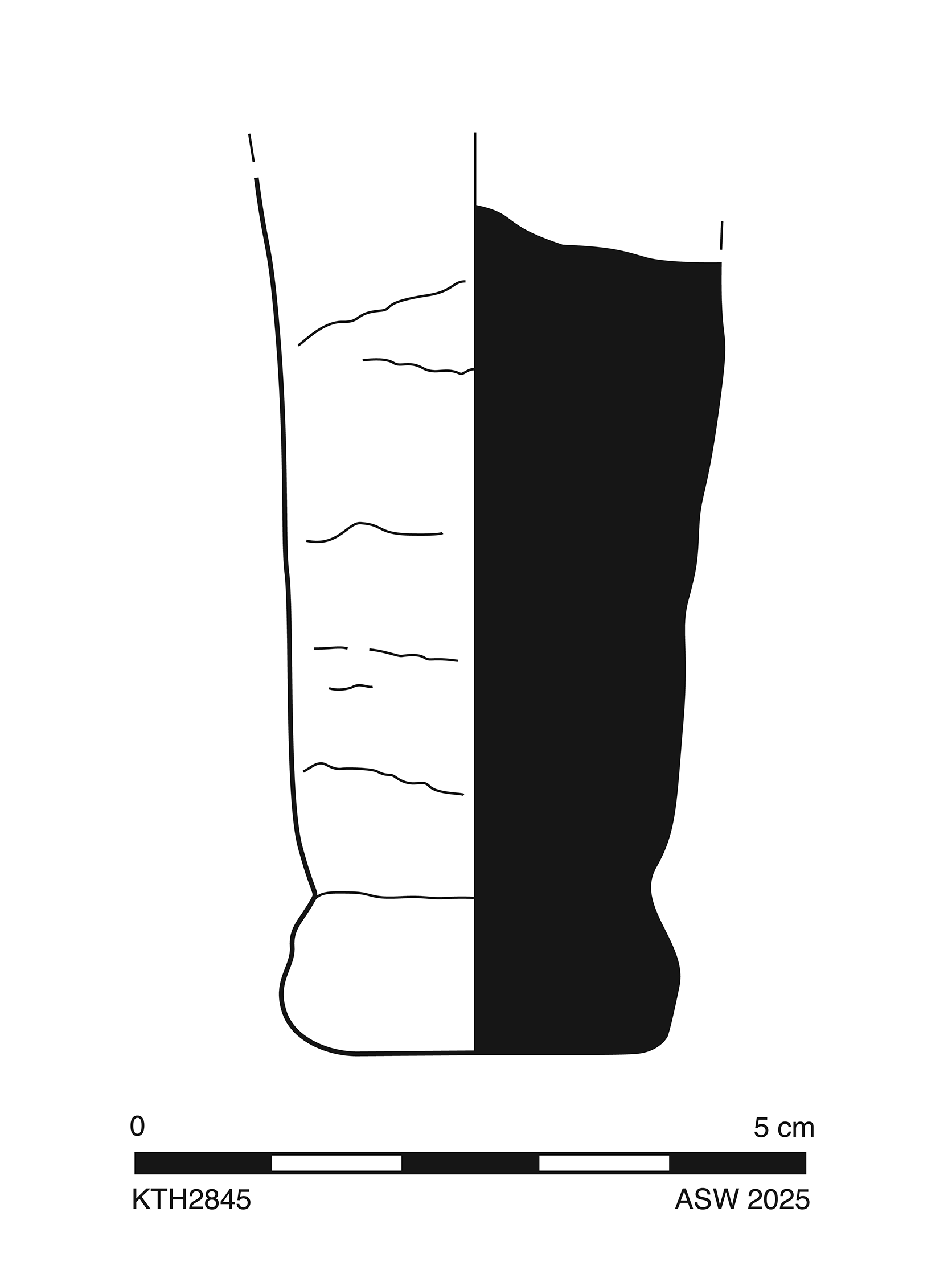 One sherd preserves lower part of spike toe. Slight, moderate abrasion; somewhat worn breaks; scattered, thin film of encrustation.