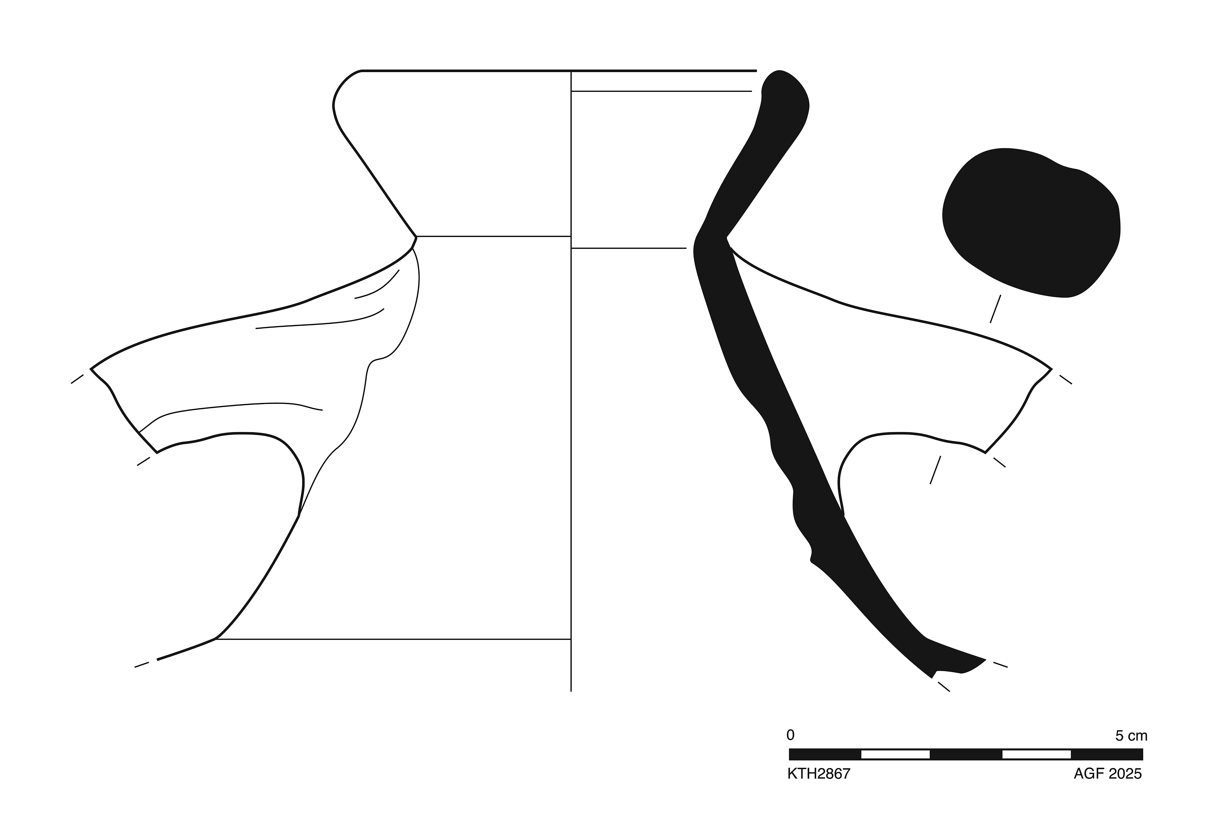 One large sherd preserves ca. 7% of rim, ca. 40% of neck down to articulation with shoulder, and one upper handle. Slight, sparse abrasion; slightly worn breaks; scattered, thin patches of rough encrustation.