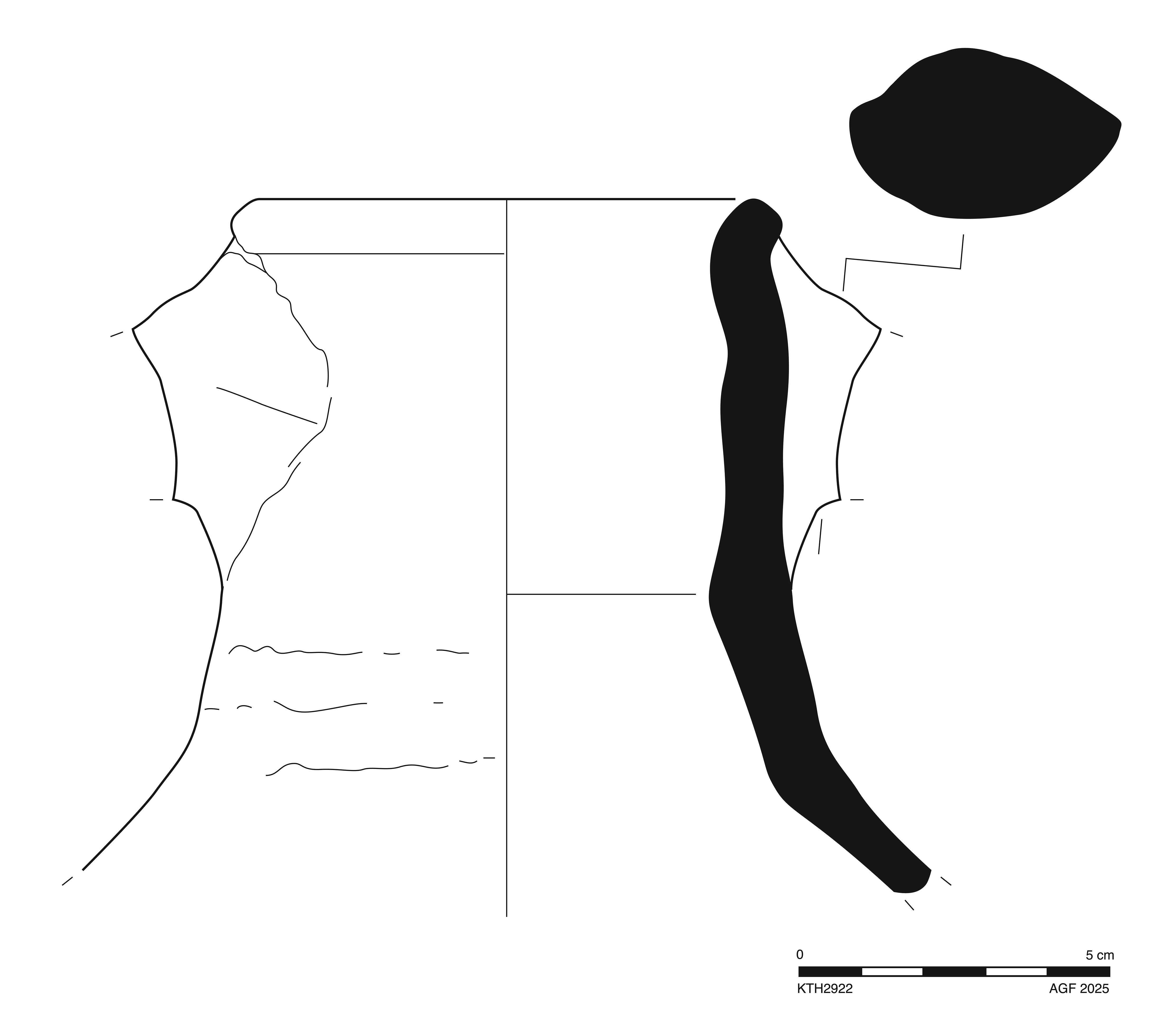 One large sherd preserves ca. 15% of neck from shoulder to rim and one upper handle attachment. Slight, sparse abrasion with chipping around edge; worn breaks; extensive, rough encrustation.
