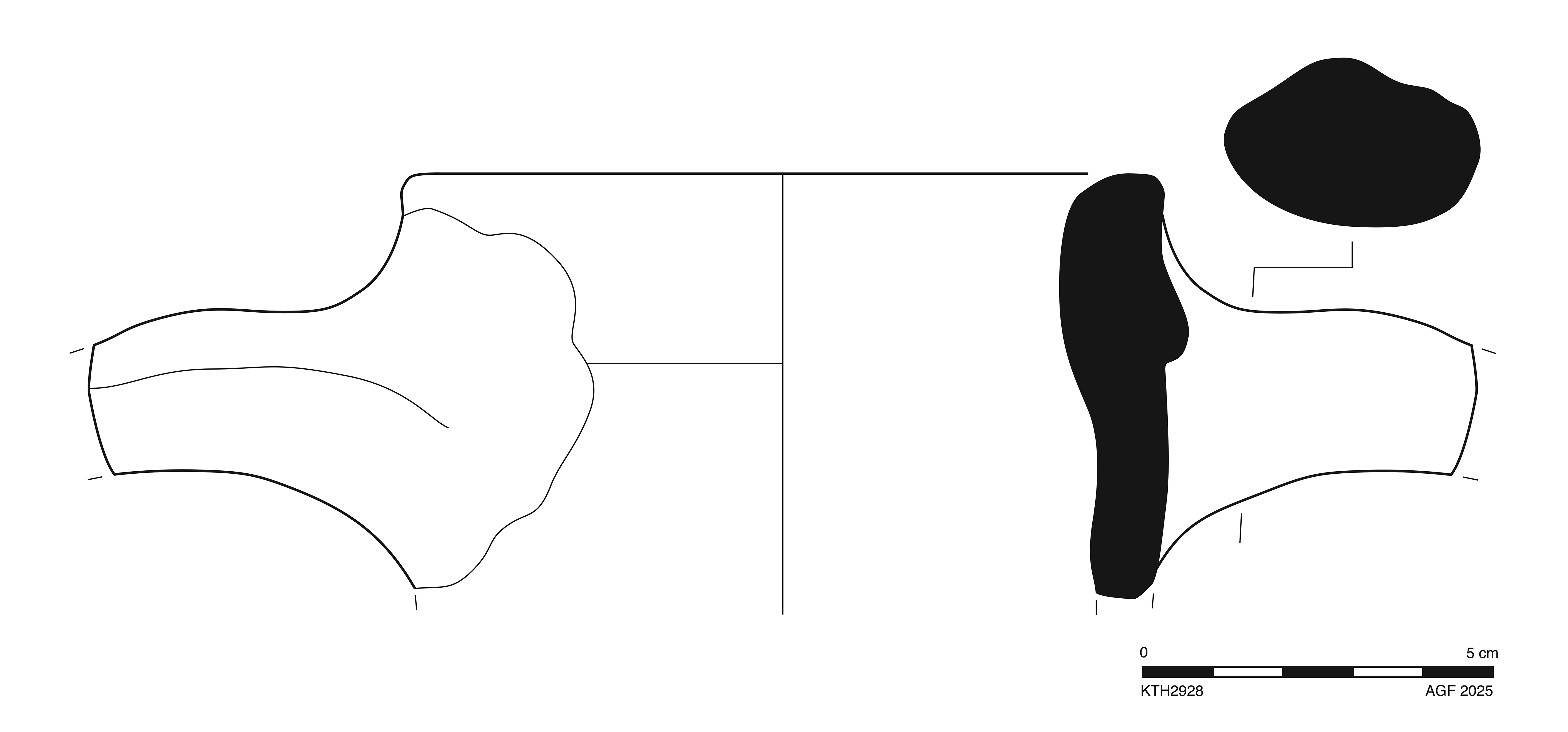 One large sherd preserves ca. 12% of rim and small part of adjacent upper neck, with upper segment of one handle. Slight, sparse abrasion and minor scraping; slightly worn breaks; widespread, thin film of encrustation.