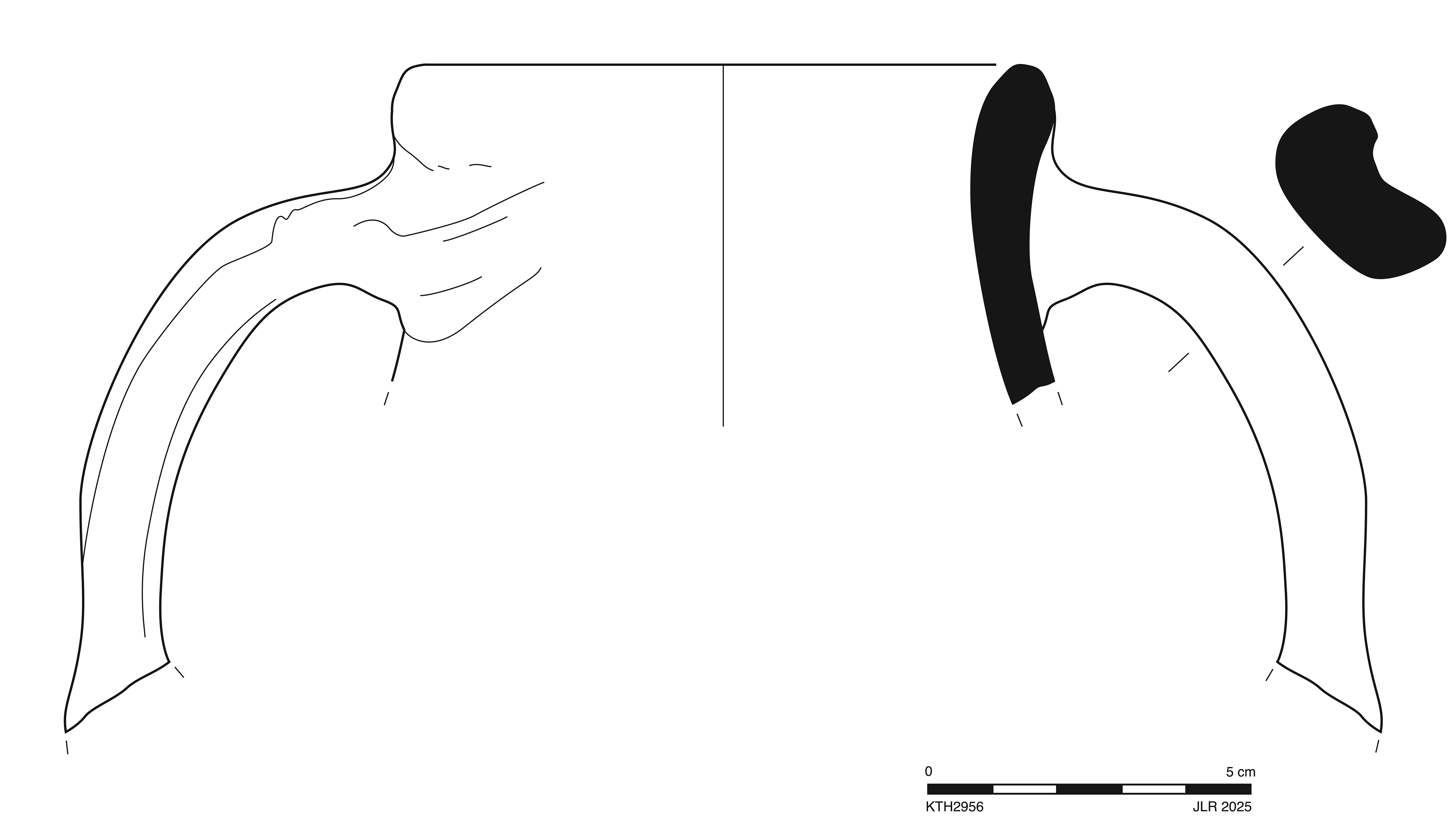 One sherd preserves 15% of rim, adjacent part of neck, and one entire handle. Slight, extensive abrasion and minor chipping; worn breaks; thin extensive encrustation.