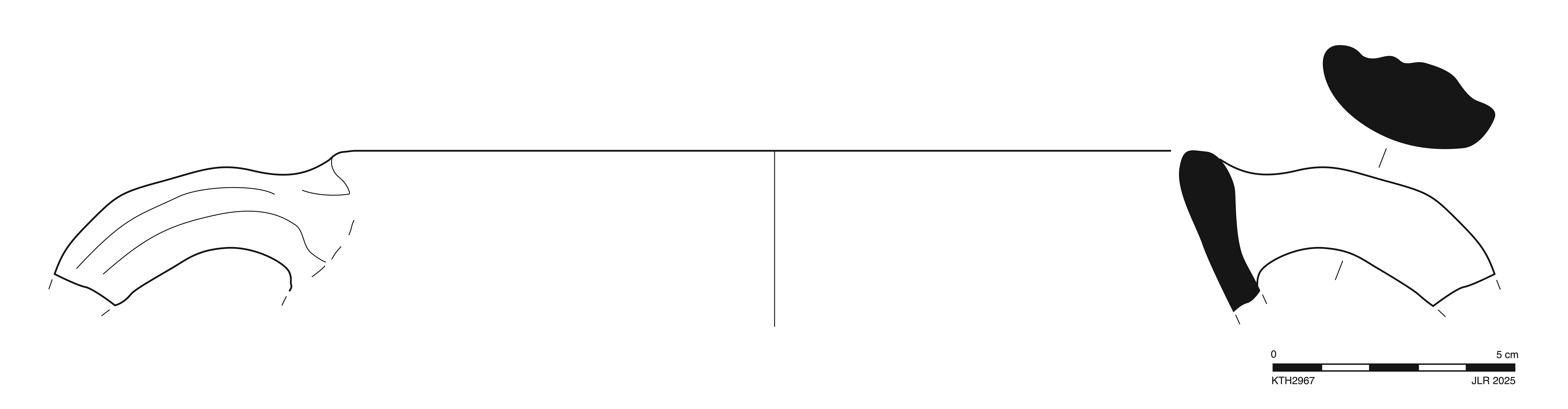 Dark reddish brown to purple, fired to orangish red at surface (1-3mm). Hard, coarse fabric; granular to vaguely hackly break; rather smooth surface texture. Rare to unccommonm, tiny white specks and occasional small, subrounded, white particles (calcareous); rare, small, angular, dark gray bits; rare, tiny red specks; all well sorted.