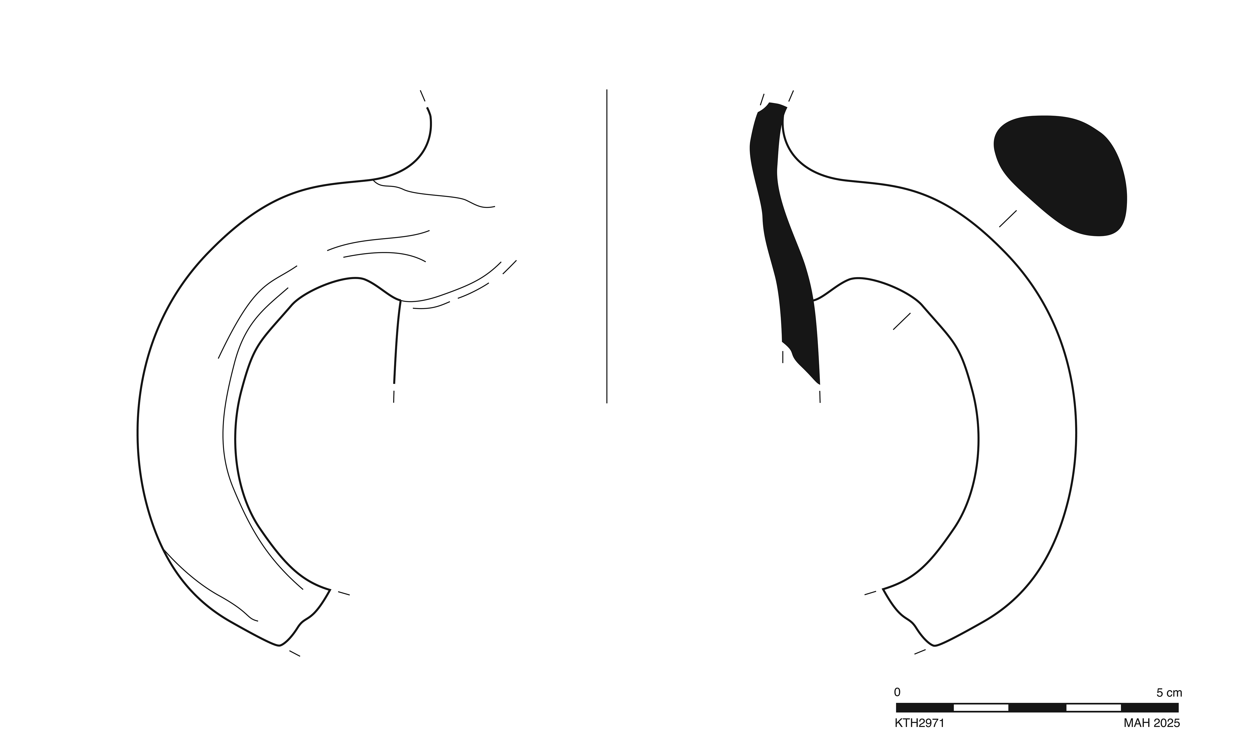 Fired dark grayish brown at core and pale brown with tinge of red at surface (2-4 mm). Hard, coarse; with smooth to vaguely laminar break and smooth surface texture. Numerous, well sorted, subrounded and angular, white, gray, and black particles; no mica.