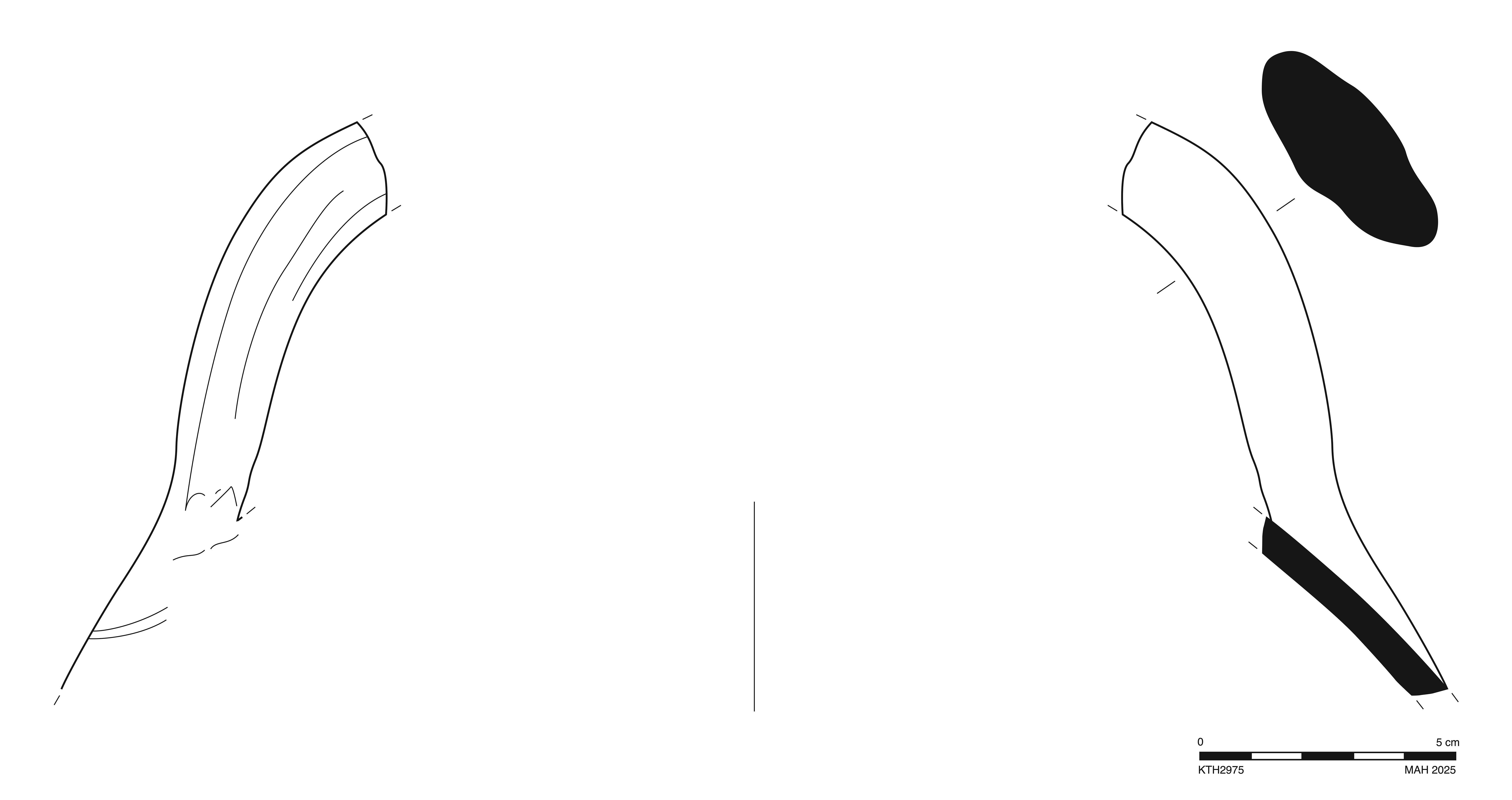 One sherd preserves middle to lower part of one handle and contiguous upper wall. Slight, sparse abrasion with scoring and gouging; clean breaks and surfaces.
