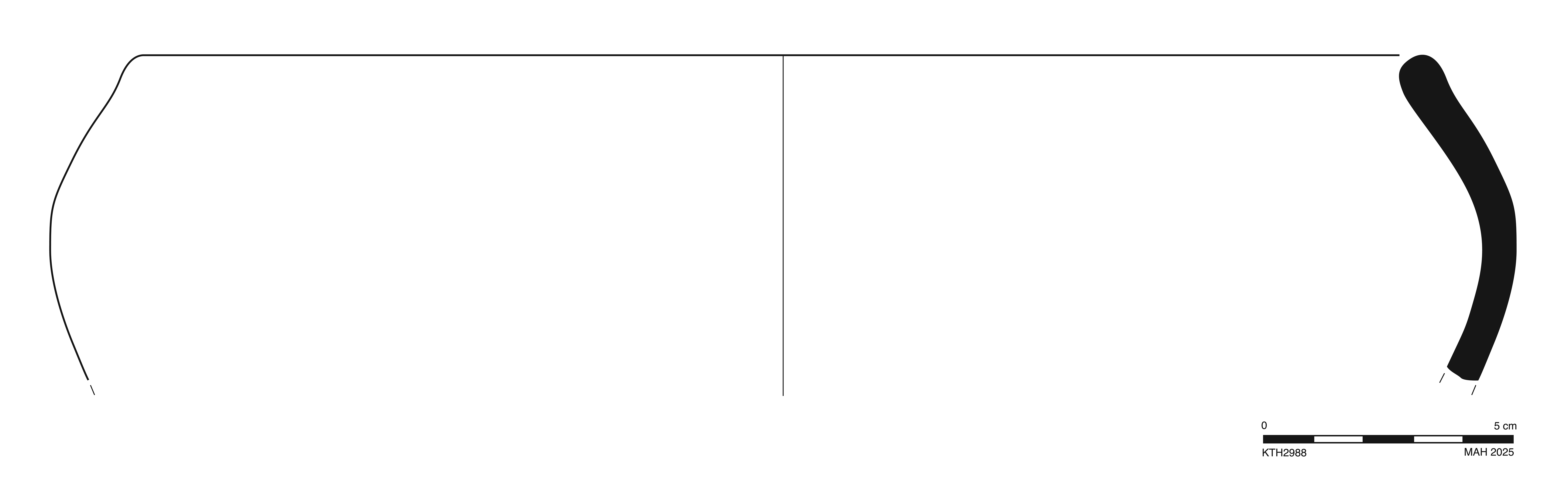 One sherd preserves ca. 16% of rim and middle to upper body. Slight to moderate, somewhat extensive abrasion with frequent scraping; somewhat worn breaks; widespread, rough patches of encrustation especially on interior surface.