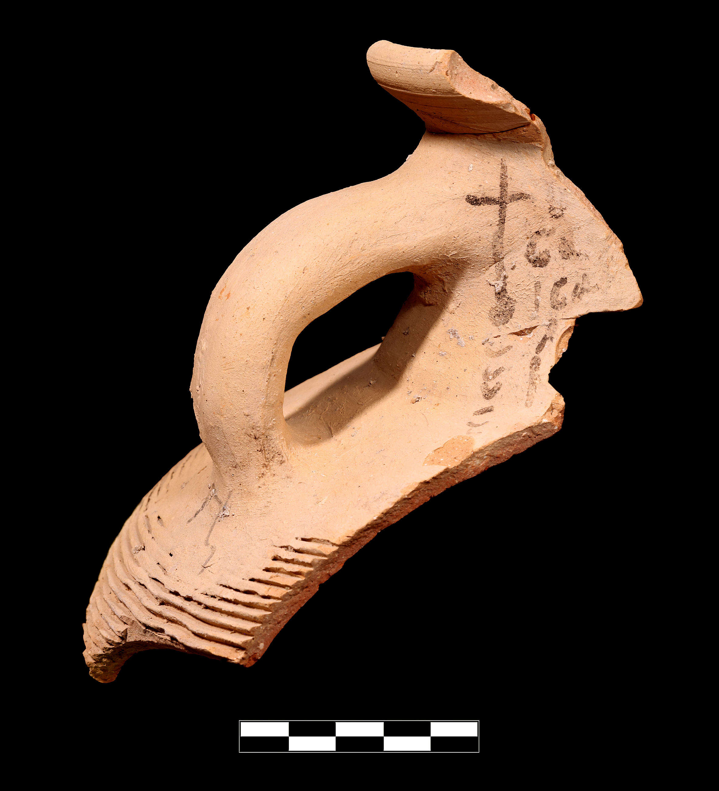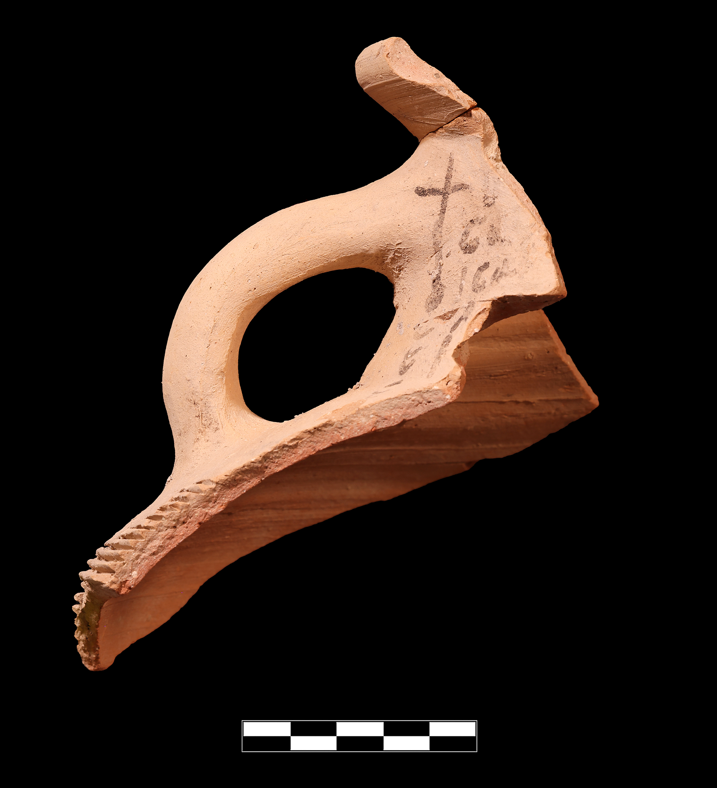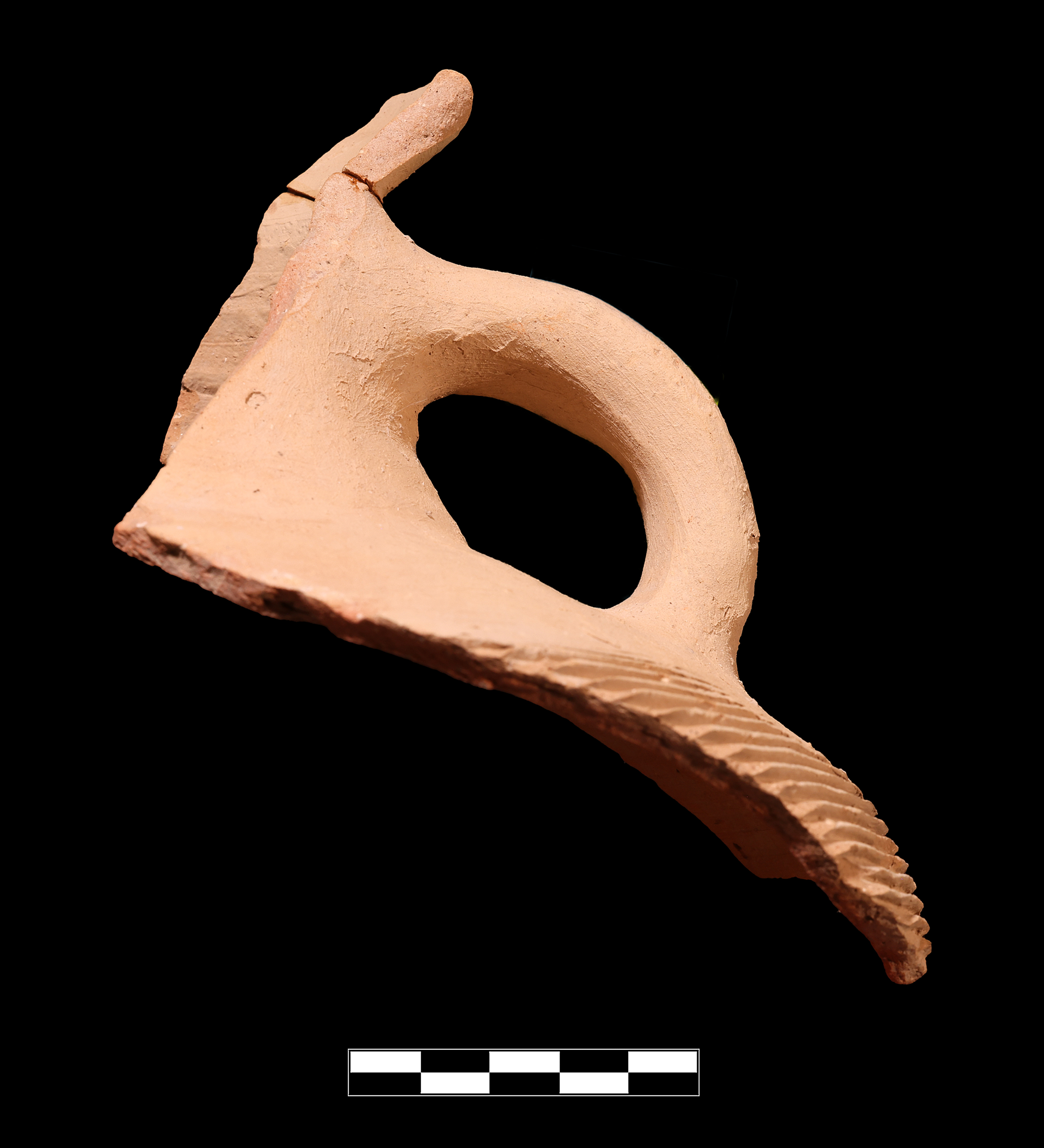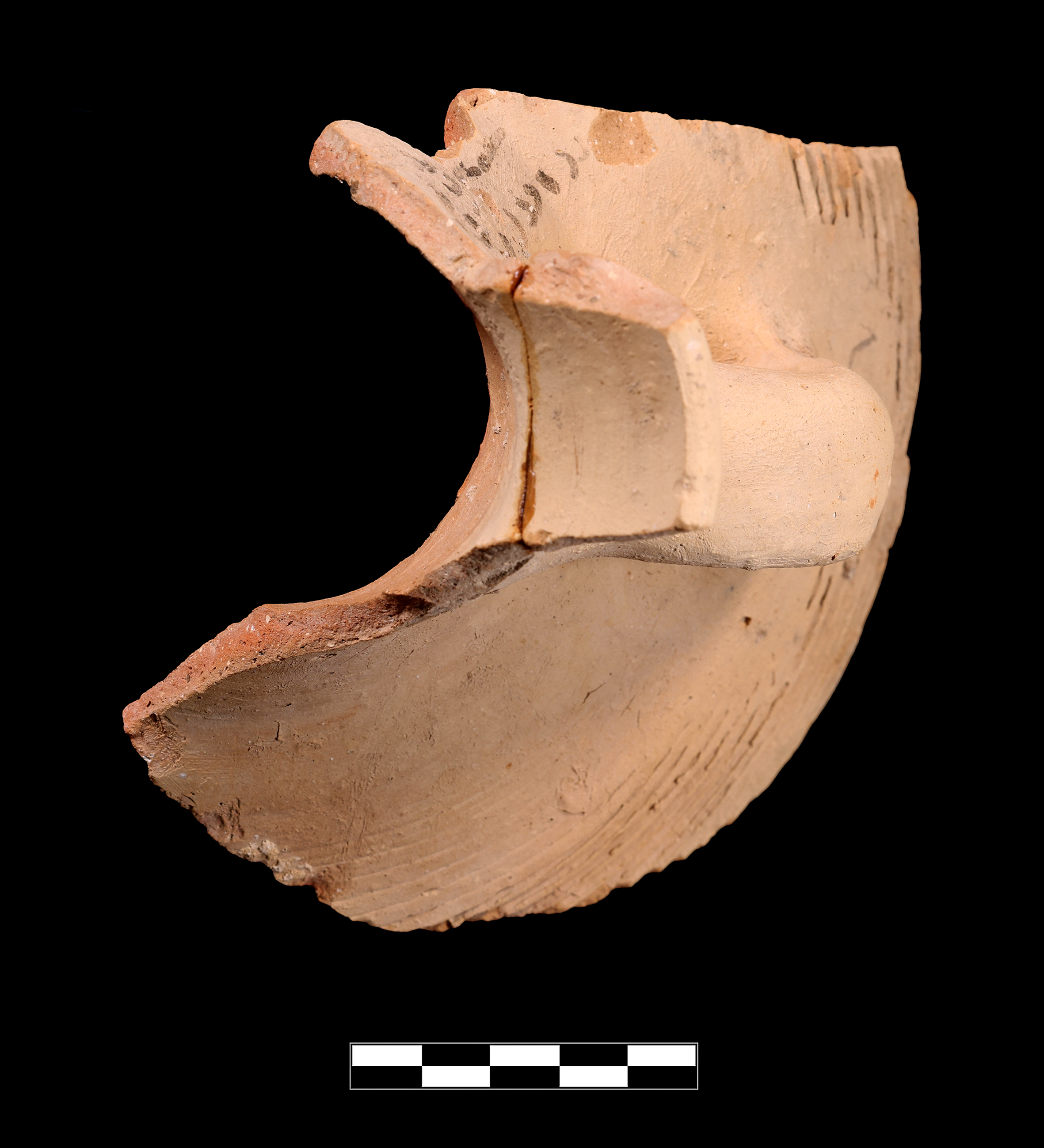 Two joining sherds preserve ca. 12% of rim, roughly 30% of neck and shoulder, and one entire handle. Very slight abrasion with rare chipping; clear breaks and surface.